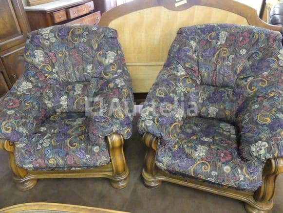 Vintage fauteuil Hoeveelheid: 2 2 fauteuils van hout en stof 1 ovale tafel van 120x63 cm Opmerkingen: Stuk grond op de eerste verdieping via de trap