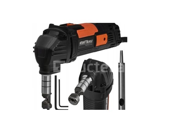 Elektrische snoeischaren voor het snijden van staal, aluminium Merk: KRAFT&DELE Kenmerken: . Plaatmetaalscharen . Plaatmetaal snijmes (pons + matrijs) . Moersleutel (2 stuks) . Vermogen: 1600W . Werkterrein: 2,5 mm aluminium 1,6 mm staal . Snijbreedte: 5 mm . Slaghoogte: 7 mm Conditie: Nieuw Scheepvaart: Tarief A