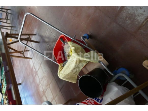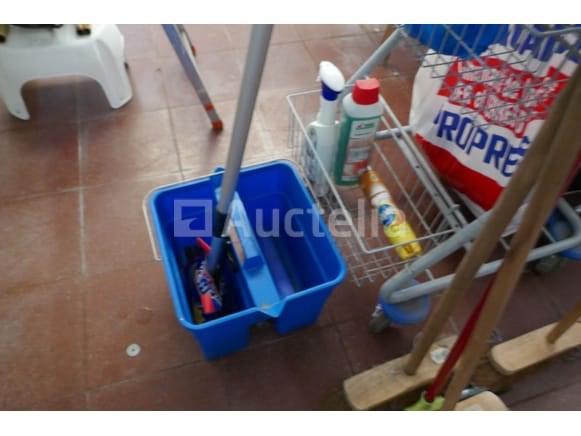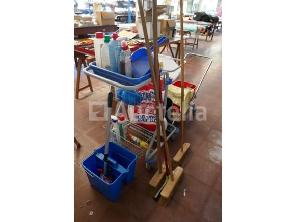 Poetswagen met borstels, emmers en onderhoudsprodukten