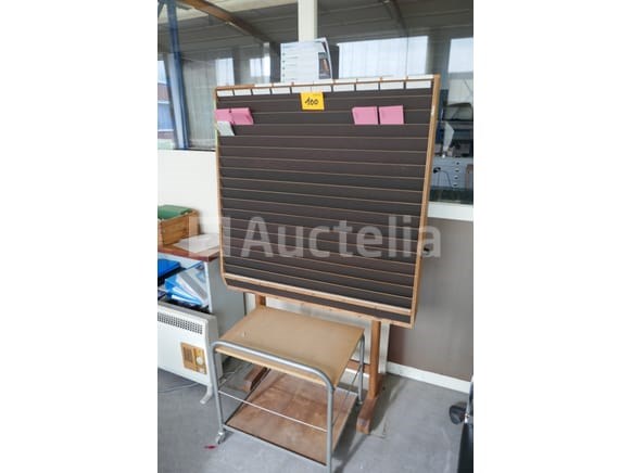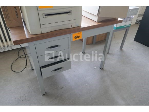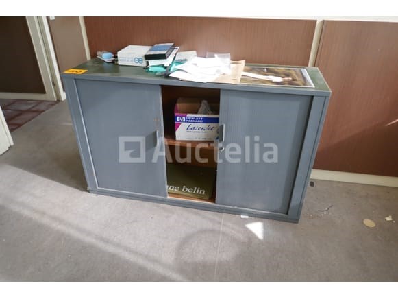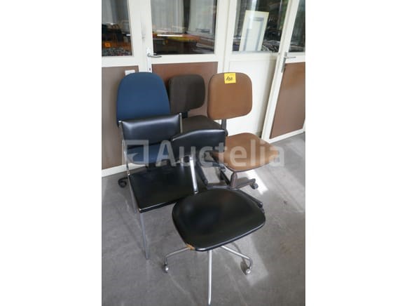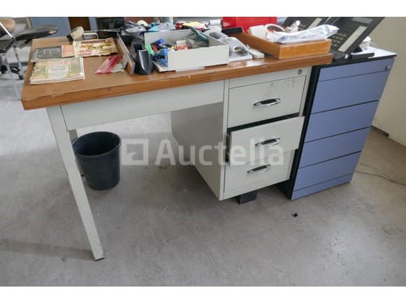 3 metalen bureautafels met laden 2 metalen ladenblokken 2 diverse verrijdbare tafeltjes verrijbare brochurehouder 5 bureaustoelen houten kast met rolluideuren laag model elektrische kachel