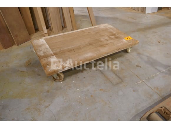 Verrijdbare houten bak met houtresten +2 transportkarren waarvan 1 met verzaagde MDF platen