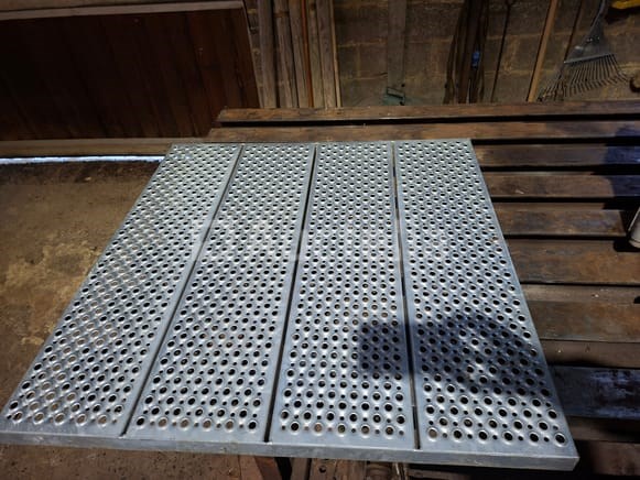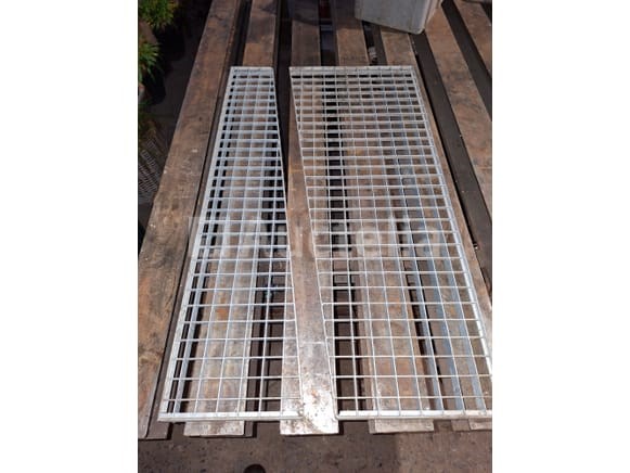 Gegalvaniseerde Staco roosters: 1 perforooster met afwatering 1m x 1m, 2 helften onder hoek 1m x 0,53m