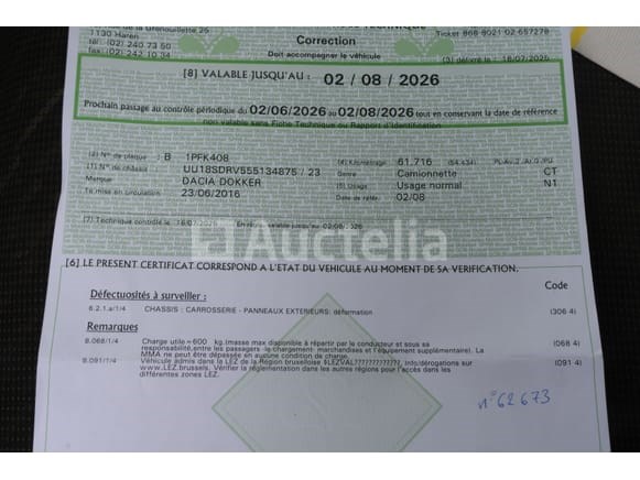 Utility pickup Merk: Dacia Model: Dokker SD Jaar: 2016 Kilometerstand: 62425 Vermogen: 75 kW Datum van eerste inschrijving: 23-06-16 Brandstof: Benzine Versnellingsbak: Handgeschakeld Airconditioning: Handmatig Radio: Ja Aantal zetels: 2 Certificaat van conformiteit: Ja Technisch keuringscertificaat: Ja Technisch keuringscertificaat geldig tot: 26-02-08 Registratiecertificaat Deel 1: Ja Registratiebewijs Deel 2: Ja Voertuig nog in gebruik (kilometerstand verandert): Nee Chassisnummer: UU18SDRV555134875 Eurostandaard: 6b Intern verkopersnummer (Ref): 62673 Staat: te worden opgeknapt Aanwezigheid van klampen en krassen door normale slijtage Het voertuig startte niet tijdens de inventarisatie Voertuig rijdt niet bij het ophalen Geleverd zonder kenteken Opmerkingen: Het voertuig is tijdens de inventarisatie niet grondig geïnspecteerd en kan defecten hebben die niet zichtbaar zijn De koper zou het perceel vóór zijn veiling hebben bezocht om de logistiek en afhandeling te plannen die nodig zijn voor het innen van zijn aankoop