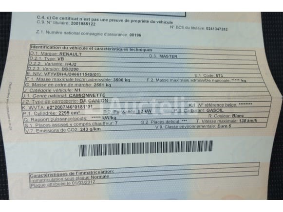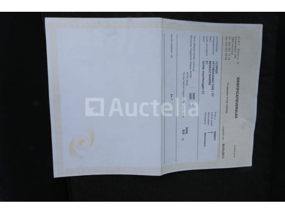 Dubbele cabine met kanter Merk: Renault Model: Master Jaar: 2012 Kilometerstand: 201332 Vermogen: 92 kW Datum van eerste inschrijving: 01-03-12 Brandstof: Diesel Verplaatsing (cc): 2299 Versnellingsbak: Handgeschakeld Airconditioning: Handmatig Radio: Ja Aantal toetsen: 1 Zitcapaciteit: 7 Certificaat van conformiteit: Ja Technisch keuringscertificaat: Ja Technisch keuringscertificaat geldig tot: 30-03-26 Registratiecertificaat Deel 1: Ja Registratiecertificaat Deel 2: geen Voertuig nog in gebruik (kilometerstand verandert): Nee Chassisnummer: VF1VBH4J246611545 Eurostandaard: 5a Intern verkopersnummer (Ref): 10408 Conditie: Niet getest MMA: 3500 kg Eigengewicht: 2600 kg Aanwezigheid van slagen, krassen en oxidatie Het voertuig startte tijdens de inventarisatie Voertuig rijden op het moment van ophalen Geleverd zonder kenteken Opmerkingen: Het voertuig is tijdens de inventarisatie niet grondig geïnspecteerd en kan defecten hebben die niet zichtbaar zijn De koper zou het perceel vóór de veiling hebben bezocht om de logistiek en afhandeling te plannen die nodig zijn voor het innen van de aankoop