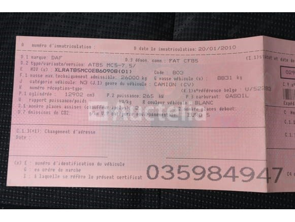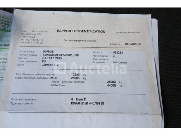 Containervrachtwagen Merk: DAF Model: CF 85.360 Jaar: 2010 Kilometerstand: 223023 Vermogen: 265 kW Datum van eerste inschrijving: 20-01-10 Brandstof: Diesel Verplaatsing (cc): 12902 Versnellingsbak: Handgeschakeld MMA: 26.000 kg Tare: 12280 kg Ophanging: Mechanisch Radio: Ja Aantal toetsen: 1 Aantal zetels: 2 Certificaat van conformiteit: Ja Technisch keuringscertificaat: Ja Technisch keuringscertificaat geldig tot: 01-03-26 Registratiecertificaat Deel 1: Ja Registratiecertificaat Deel 2: geen Vrachtwagengegevens: Ja Identificatierapport: Ja Voertuig nog in gebruik (kilometerstand verandert): Nee Chassisnummer: XLRAT85MC0E860908 Eurostandaard: 5 Intern verkopersnummer (Ref): 14228 Conditie: Niet getest Aanwezigheid van slagen, krassen en oxidatie door normale slijtage Het voertuig startte tijdens de inventarisatie Voertuig rijden op het moment van ophalen Geleverd zonder kenteken Opmerkingen: Het voertuig is tijdens de inventarisatie niet grondig geïnspecteerd en kan defecten hebben die niet zichtbaar zijn De koper zou het perceel vóór de veiling hebben bezocht om de logistiek en afhandeling te plannen die nodig zijn voor het innen van de aankoop