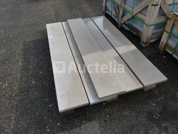 Marmeren planken Lengte: 130,5 cm Breedte: 19,5 cm Hoogte: 2 cm Hoeveelheid: +/- 5 Batch verspreid over een pallet Opmerkingen: Aanbevolen bezoek
