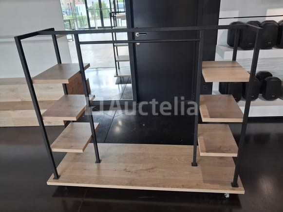 Ontwerpdisplay op wielen Lengte: 164 cm Breedte: 60 cm Hoogte: 130 cm Aantal: 7 In Licht Hout 1 Hangstang 6 Planken Aanbevolen bezoek