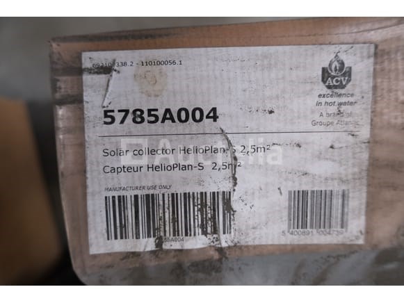 Thermische zonnepanelen (2,5 m²) Merk: ACV Model: Helioplan S Hoeveelheid: +- 2 In hun originele verpakking Geleverd met bevestigingsaccessoires Opmerkingen: Aanbevolen bezoek