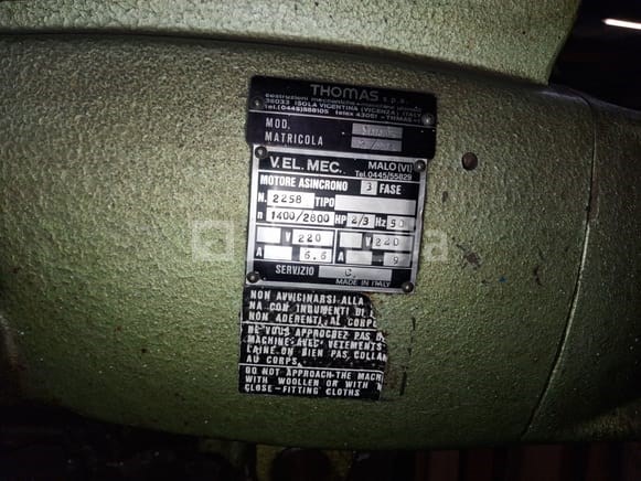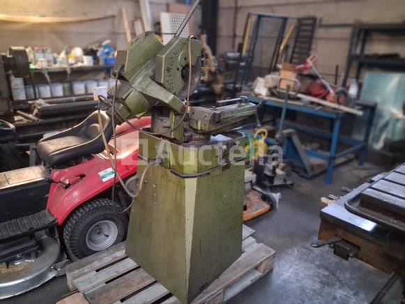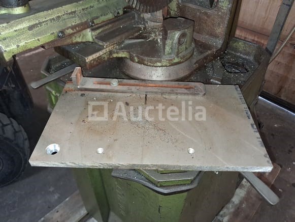 Cirkelzaagmachine Merk: Thomas Model: 300 E Type: Langzaamlopende koudcirkelzaag voor metaal Bouwjaar: 1984 Serienummer: 2/84 Motor: 2-snelheden Dahlander motor (3-fase) Toerental: 1400 / 2800 TPM (motortoerental) – vertaald naar twee zaagsnelheden via de tandwielkast. Vermogen: 2 / 3 PK (1,5 / 2,2 kW) Voltage: 220V (3-fase) Zaagblad: Voorzien van een HSS zaagblad (diameter ca. 250-315 mm). Verstek: De zaagkop is zwenkbaar voor verstekzaagsneden (tot 45°).