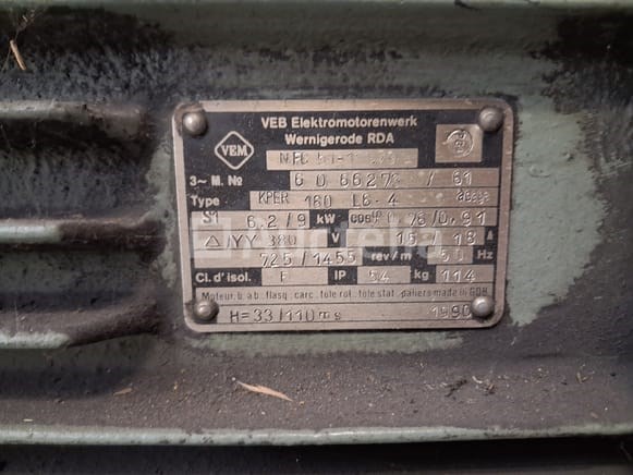 2-snelheids Dahlandermotor Merk: VEM (VEB Elektromotorenwerk Wernigerode) Type: KPER 160 L8-4 (NFC 51-111.79) Bouwjaar: 1990 Gewicht: 114 kg Vermogen: 6,2 kW (bij laag toerental) / 9 kW (bij hoog toerental) Toerental: 725 TPM / 1455 TPM (bij 50 Hz) Spanning: 380V (3-fase) Stroomsterkte: 15 A / 18 A Beschermingsklasse: IP 54 (stof- en spatwaterdicht) Isolatieklasse: F