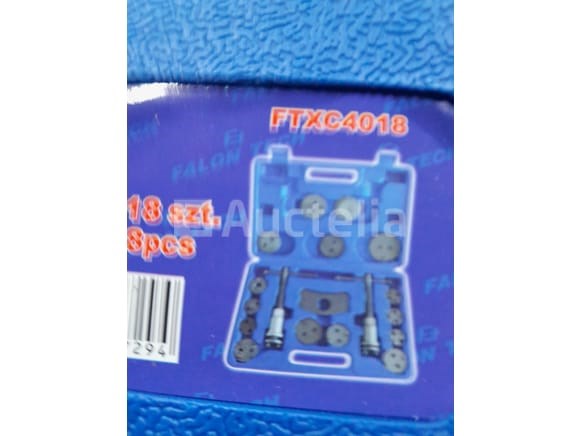 Remzuigerdrukkit (18 stuks) in een behuizing Merk: FALON-TECH De kit geldt voor veel automerken: Audi, Opel, SAAB, Citroën, Suzuki, BMW, Mercedes Benz, Ford, Jaguar, VW, Nissan, Fiat, Isuzu, Volvo, Seat, Alfa Rome, Honda, Mitsubishi, Toyota, Renault, Peugeot en vele anderen werden verkocht op de Europese, Amerikaanse en Aziatische markten. De set bevat: . Rechtshandige pers . Druk links . Balk voor het klemmen van de pers op het zadel van de remklauw. . Een set remzuigercompressorschijven Conditie: Nieuw Scheepvaart: Tarief A