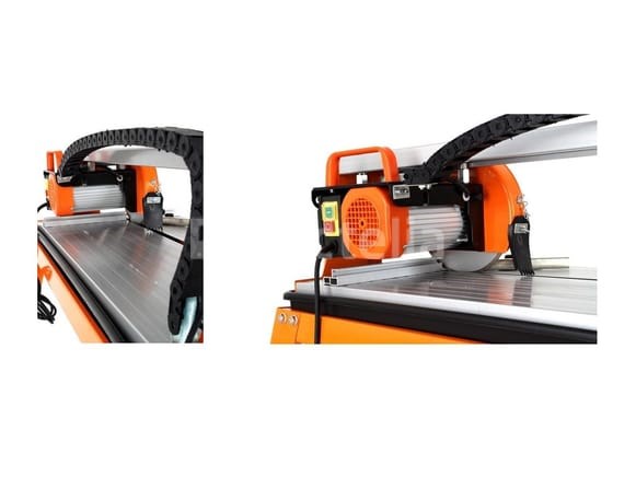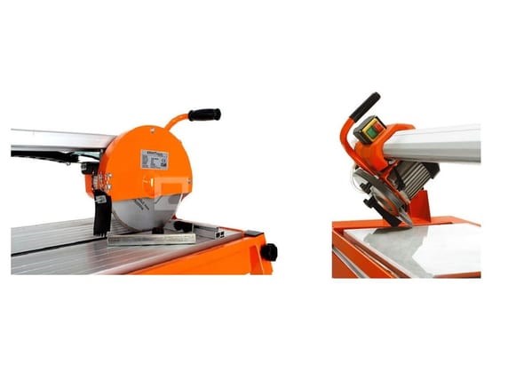 Tafeltegelsnijder Merk: KRAFT&DELE Nauwkeurig snijden van alle soorten tegels, evenals porselein, marmer en stenen platen. Er is een kantelverstel, een schaalhoekschaal. De tafel is stabiel, lichtgewicht, draagbaar en gemaakt van roestvrij staal. Met het juiste mes kan het apparaat als houthakker worden gebruikt. De snijder kan in standaard, hellend of "diamant" snijden. Uitgerust met een diamantblad en een watercontainer om het lemmet te koelen. Kenmerken: . De tafel is gemaakt van roestvrij staal, . Hij heeft: kantelverstelling, hoekschaal, gradenboog en automatische waterpomp, magnetische schakelaar, aluminium werktafel. Specificaties: . Spanning/Frequentie: 230V-50 Hz . Motorvermogen: 1900 W . Snelheid zonder lading: 2950/min . Schijfgrootte: Ø200 mm . Max. 90° Sneddiepte: . 32 mm maximaal. 45° snijdiepte: . 28 mm maximaal. snijlengte: 920 mm . Bladgatdiameter: Ø25,4 mm . Tafelmaten: 960 mm x 390 mm . Netto gewicht: 36 kg Conditie: Nieuw Scheepvaart: Tarief D