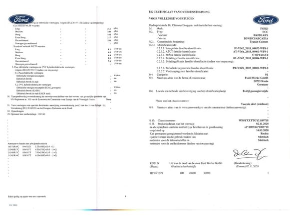 Nut Merk: Ford Model: Transit Custom Jaar: 2021 Kilometerstand: 155.976 Vermogen: 95 kW Datum van eerste inschrijving: 13-01-2021 Brandstof: Diesel Verplaatsing (cc): 1995 Versnellingsbak: Handgeschakeld Airconditioning: Handmatig Radio: Ja Achteruitrijdende radar: Ja Achteruitrijcamera: Nee Aantal toetsen: 2 Aantal zetels: 3 Certificaat van conformiteit: Ja Technisch keuringscertificaat: Ja Technisch keuringscertificaat geldig tot: 26-11-02- Registratiecertificaat Deel 1: Ja Registratiecertificaat Deel 2: Nee Voertuig nog in gebruik (kilometerstand verandert): Nee Chassisnummer: WF0YXXTTGYLS89718-01 Eurostandaard: 6D-T-E-ISC Conditie: Niet getest Het voertuig startte tijdens de inventarisatie Het voertuig is uitgerust met een sleepstang Opmerkingen: Aanbevolen bezoek Het voertuig wordt verkocht zonder kenteken Het voertuig kan defecten hebben die niet zichtbaar zijn tijdens de inventarisatie