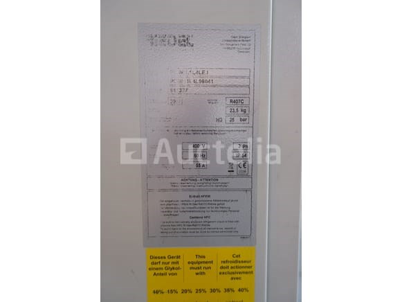 Dubbele circuit industriële koeler Merk: Riedel Model: PC 801.1L4LE. I Jaar: 2007 Openingstijden: 15:00 Spanning: 400V driefasig Lengte: 220 cm Breedte: 110 cm Hoogte: 200 cm Status: Functioneel op Inventarisatiedag Koelmiddelgastype: R407C Hoeveelheid: 23,5 kg Druk: 25 bar Nieuwe filters te koop Aantal machineuren: +/- 1500 uur Opmerkingen: Aanbevolen bezoek