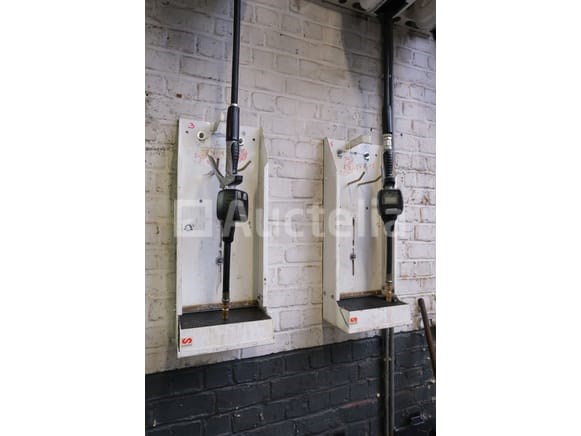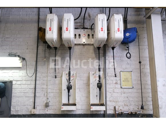 Set van 6 wandgemonteerde slangspoelen Merk: Samoa Spanning: 400V driefasig Capaciteit: 3200 kg Status: Functioneel op Inventarisatiedag Te worden op locatie afgebroken op een hoogte van +/- 300 cm 2x olie met doseerpistool 2 x perslucht 1 x verlengsnoer met handlamp 1 x verlengsnoer Opmerkingen: Aanbevolen bezoek