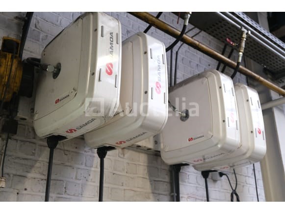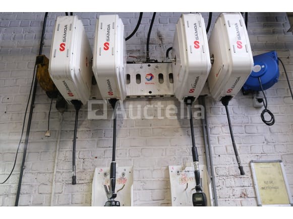 Set van 6 wandgemonteerde slangspoelen Merk: Samoa Spanning: 400V driefasig Capaciteit: 3200 kg Status: Functioneel op Inventarisatiedag Te worden op locatie afgebroken op een hoogte van +/- 300 cm 2x olie met doseerpistool 2 x perslucht 1 x verlengsnoer met handlamp 1 x verlengsnoer Opmerkingen: Aanbevolen bezoek