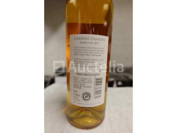 Flessen witte wijn 75 cl - Argentinië Merk: Carmine Granata Model: Semillon 2017 Aantal: +- 120 Per kist van 12 flessen Opmerkingen: Aanbevolen bezoek