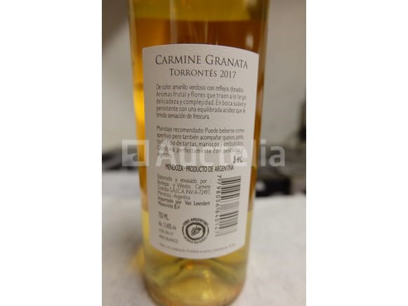 Flessen witte wijn 75 cl - Argentinië Merk: Carmine Granata Model: Torrontes 2017 Aantal: +- 60 Per kist van 12 flessen Opmerkingen: Aanbevolen bezoek