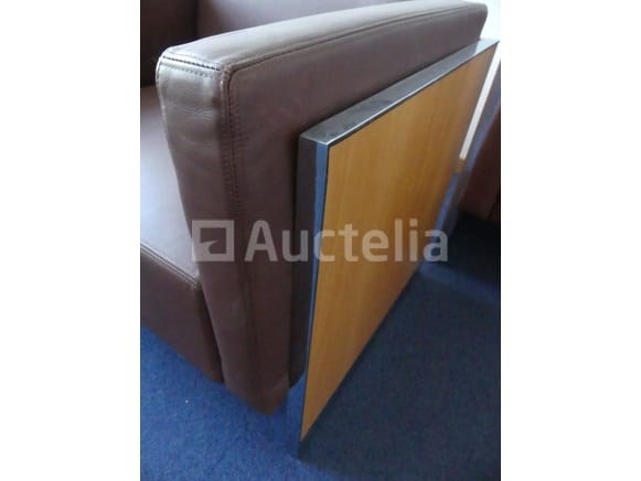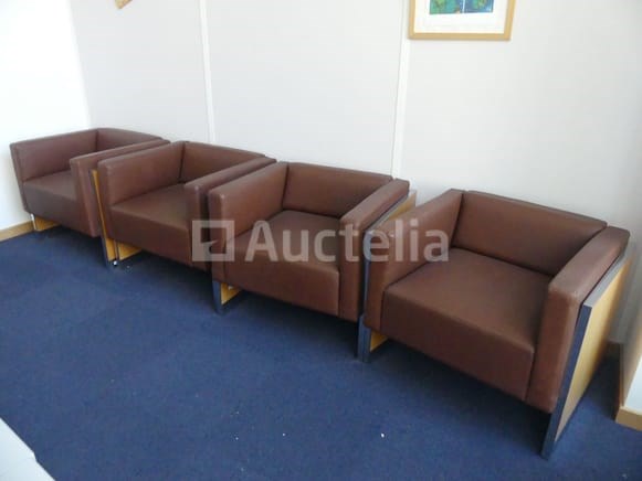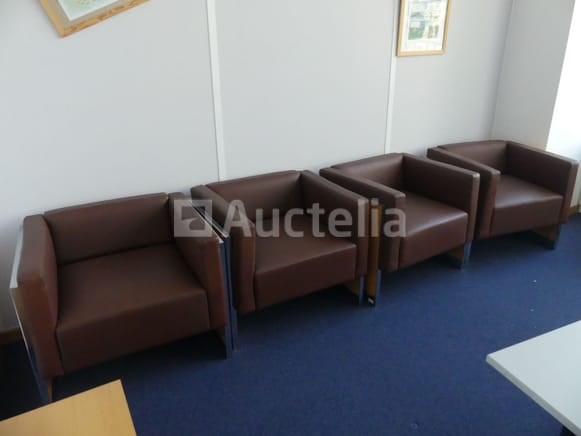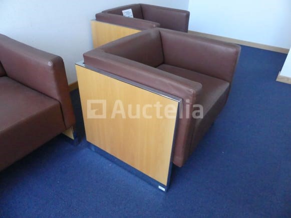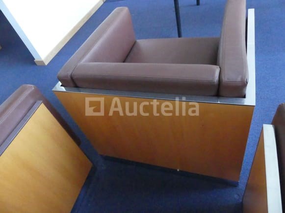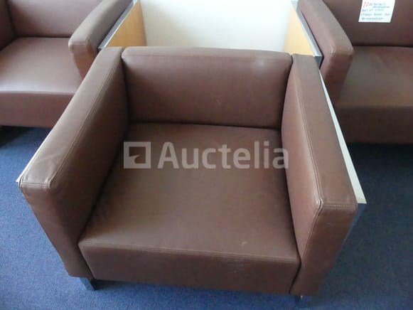 Ligstoelen Lengte: 78 cm Breedte: 67 cm Hoogte: 66 cm Aantal: +- 8 Bruin nepleren fauteuil met houten frame Geleverd met 2 salontafels van 40x40x42 cm