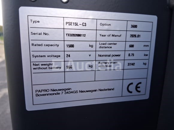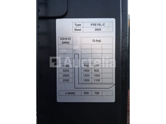 Ongebruikt. Technische gegevens Type: PSE15L-C3 Serienummer: YX3202501791 Bouwjaar: 12/2025 Hefhoogte: 3600 mm Draagcapaciteit: 1500 kg Lastzwaartepunt: 600 mm Systeemspanning: 24 V Nominaal vermogen: 0,75 kW Eigen gewicht (zonder batterij): 556 kg Batterijgewicht (min/max): 37 / 42 kg