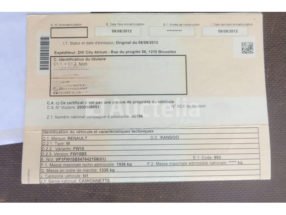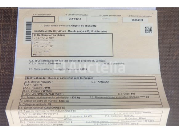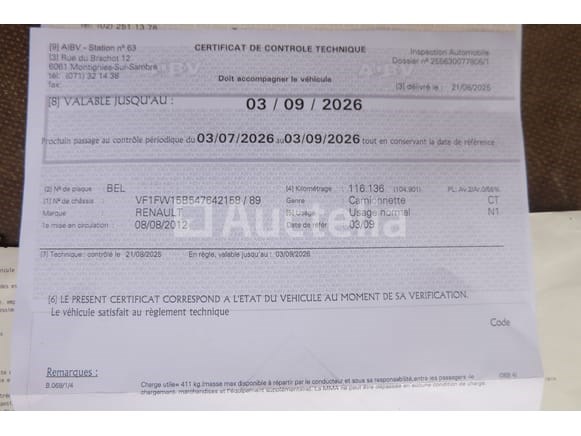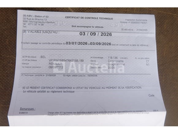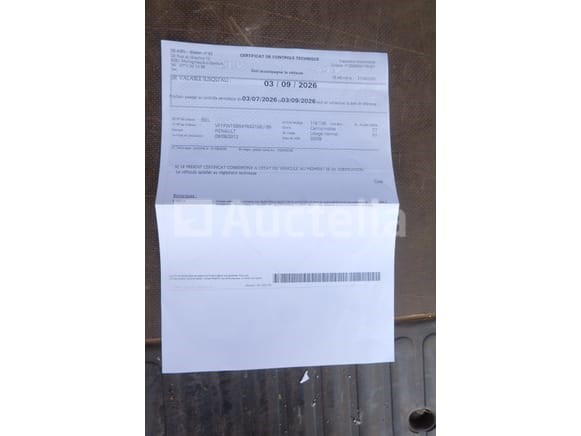 Utility bus Merk: Renault Model: Kangoo 1.5 DCI 80 Jaar: 2012 Kilometerstand: 116225 Vermogen: 66 kW Datum van eerste inschrijving: 08-08-12 Brandstof: Diesel Verplaatsing (cc³): 1461 Versnellingsbak: Handgeschakeld Airconditioning: Handmatig Radio: Ja Aantal toetsen: 1 Aantal zetels: 2 Certificaat van conformiteit: Ja Technisch keuringscertificaat: Ja Technisch inspectiecertificaat geldig tot: 03-09-26 Registratiecertificaat Deel 1: Ja Registratiecertificaat Deel 2: geen Voertuig nog in gebruik (kilometerstand verandert): Nee Chassisnummer: VF1FW15B547642158 Eurostandaard: 5 Aanwezigheid van letters op de carrosserie Het voertuig startte op de dag van de inventarisatie Voertuig rijden op het moment van ophalen Geleverd zonder kenteken Opmerkingen: Het voertuig heeft tijdens het bezoek geen grondige inspectie ondergaan en kan niet-zichtbare gebreken bevatten De koper zou het perceel vóór zijn veiling hebben bezocht om de logistiek en afhandeling te plannen die nodig zijn voor het innen van zijn aankoop