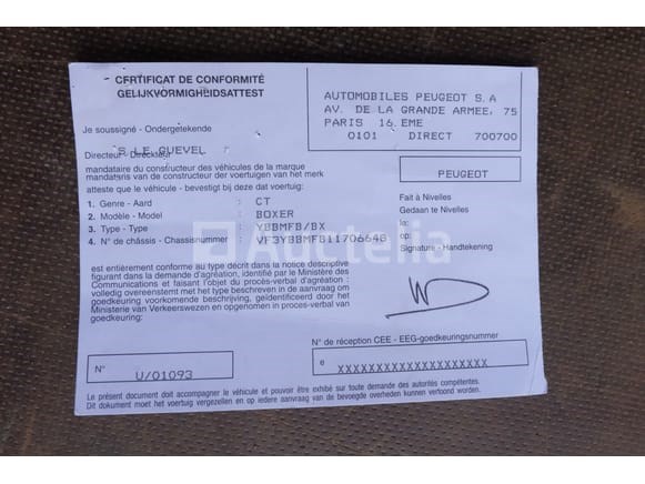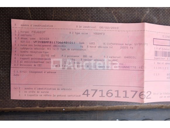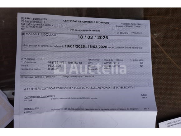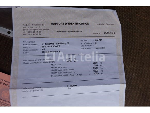 Utility bus Merk: Peugeot Model: Boxer Jaar: 2010 Kilometerstand: 158103 Vermogen: 88 kW Datum van eerste inschrijving: 08-02-10 Brandstof: Diesel Verplaatsing (cc): 2198 Versnellingsbak: Handgeschakeld Airconditioning: Nee Radio: Ja Aantal toetsen: 1 Aantal zetels: 3 Certificaat van conformiteit: Ja Technisch keuringscertificaat: Ja Technisch keuringscertificaat geldig tot: 18-03-26 Registratiecertificaat Deel 1: Ja Registratiecertificaat Deel 2: geen Voertuig nog in gebruik (kilometerstand verandert): Nee Chassisnummer: VF3YBBMFB11706648 Eurostandaard: 4 Aanwezigheid van letters op de carrosserie Aanwezigheid van slagen, krassen en oxidatie 1 band die links voor gerepareerd moet worden Het voertuig startte op de dag van de inventarisatie Voertuig rijden op het moment van ophalen Geleverd zonder kenteken Opmerkingen: Het voertuig heeft tijdens het bezoek geen grondige inspectie ondergaan en kan niet-zichtbare gebreken bevatten De koper zou het perceel vóór zijn veiling hebben bezocht om de logistiek en afhandeling te plannen die nodig zijn voor het innen van zijn aankoop