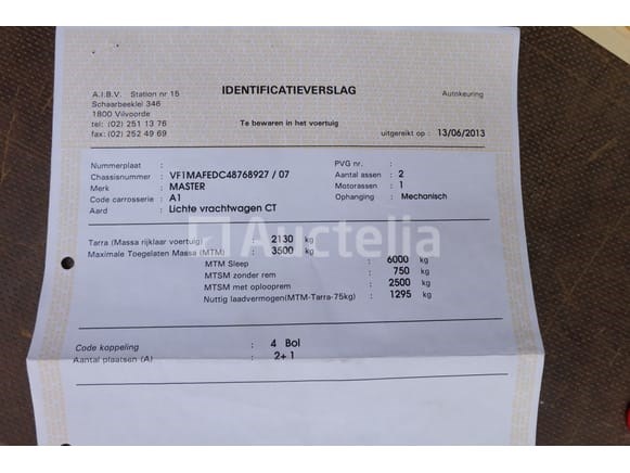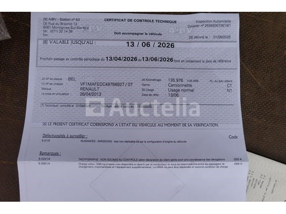 Utility bus Merk: Renault Model: Master 1.9 DCI Jaar: 2013 Kilometerstand: 137970 Vermogen: 92 kW Datum van eerste inschrijving: 26-04-13 Brandstof: Diesel Verplaatsing (cc): 2299 Versnellingsbak: Handgeschakeld Airconditioning: Nee Radio: Ja Aantal toetsen: 1 Aantal zetels: 3 Certificaat van conformiteit: Ja Technisch keuringscertificaat: Ja Technisch inspectiecertificaat geldig tot: 13-06-26 Registratiecertificaat Deel 1: Ja Registratiecertificaat Deel 2: geen Voertuig nog in gebruik (kilometerstand verandert): Nee Chassisnummer: VF1MAFEDC48768927 Eurostandaard: 5 Aanwezigheid van letters op de carrosserie Het voertuig startte op de dag van de inventarisatie Voertuig rijden op het moment van ophalen Geleverd zonder kenteken Opmerkingen: Het voertuig heeft tijdens het bezoek geen grondige inspectie ondergaan en kan niet-zichtbare gebreken bevatten De koper zou het perceel vóór zijn veiling hebben bezocht om de logistiek en afhandeling te plannen die nodig zijn voor het innen van zijn aankoop