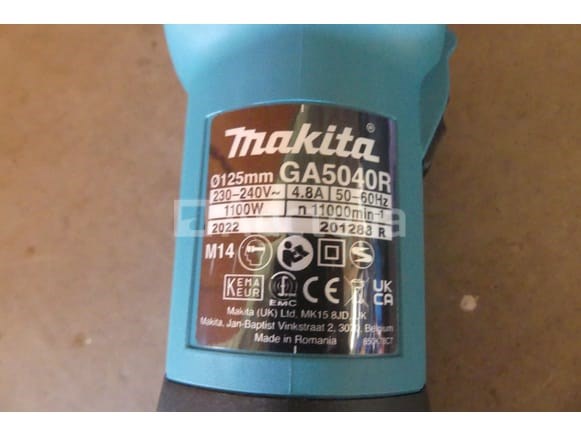 Haakse slijpmachine Merk: Makita Model: GA5040R Jaar: 2022 Spanning: 230V Mono Vermogen: 1100 watt Status: Functioneel op Inventarisatiedag In de opslagkist