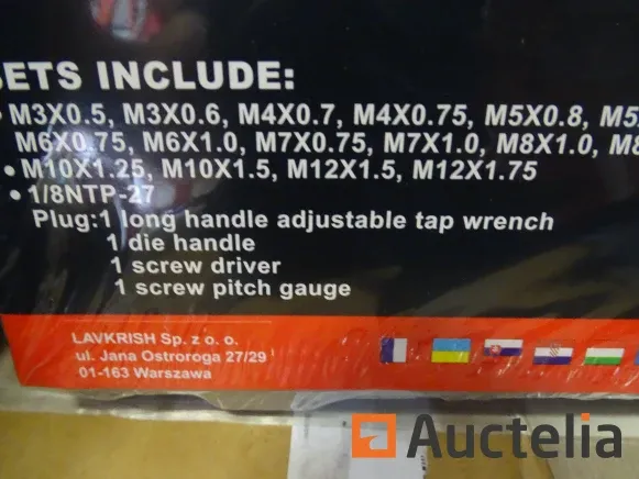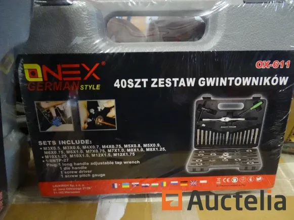Doos met 40 stukken draadsnijders en draadtappen Merk: Onex Model: O-611 Aantal: 1 stuk Staat: nieuw Verzending: Tarief A