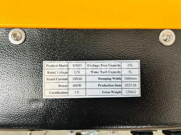 Width of brush disk 1060mm; work capacity 4800m/h; garbage bin capacity 35L; clean watertank 5L 12V/100Ah; working hours 4-5h; Power 400W;