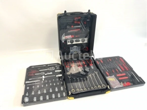 Aluminium: ja; met inhoud: ja; afmeting L: 210 mm; afmeting B: 370 mm; afmeting H: 520 mm; omschrijving: 186 delig; w.o. steek- ringsleutel met ratel; diverse tangen; doppenset met ratel; diverse schroevendraaiers; precisieschroevendraaiers; inbussleutel; diverse bits; klauwhamer; krimptang; schaar; rolmaat; waterpas; hetelijmpistool; kunststof klemmen; tapijtmes;