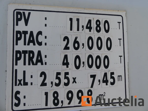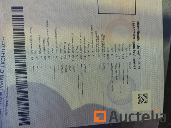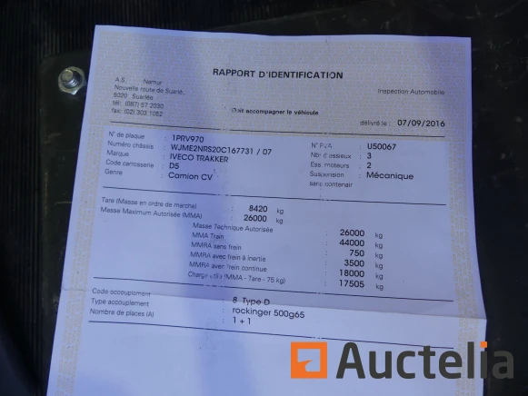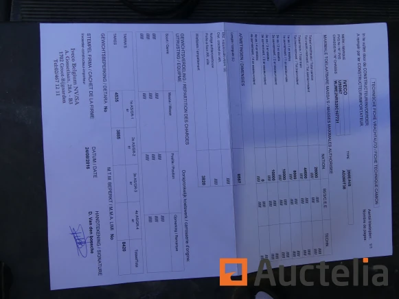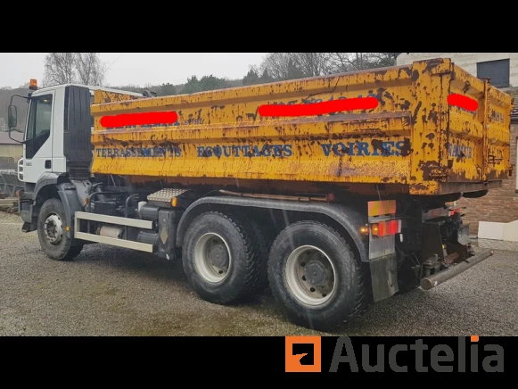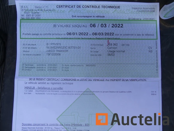 Container vrachtwagen + container 11 m³ Merk: Iveco Model: Trakker 380 Jaar: 2006 Vermogen: 353 kW Datum 1e inschrijving: 19-02-06 Brandstof: Diesel Verplaatsing (cm³) : 12900 Versnellingsbak: Handgeschakeld MMA: 26000 kg Ledig gewicht : 8420 kg Wielbasis: 382 cm Ophanging: Mechanisch Radio: Ja Aantal toetsen: 1 Aantal zitplaatsen: 2 Certificaat van overeenstemming: Ja Certificaat technische keuring: Ja Bewijs van inschrijving deel 1: Ja Bewijs van inschrijving deel 2: Ja Gegevensblad vrachtwagen : Ja Identificatierapport: Ja Voertuig nog in dienst (kilometerstand evolueert): Nee Chassisnummer: WJME2NRS20C167731 Staat: Niet getest Laatst bekende kilometerstand: 259362 km per 27/01/2021 Lege batterij Het voertuig is niet gestart tijdens de inventarisatie Geleverd zonder kenteken Geleverd met een open container 11 m³ Afmetingen: 550 cm x 235 cm x 140 cm Palfinger Palift T20 ampliroll systeem Jaar: 2006 Opmerkingen: Het voertuig heeft tijdens de inventarisatie geen grondige inspectie ondergaan en kan niet-zichtbare gebreken vertonen De koper wordt geacht het onroerend goed vóór de veiling te hebben bezocht in afwachting van enige afhandeling voor het ophalen van zijn aankoop