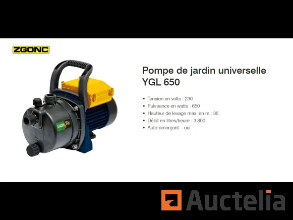 Universele tuinpomp Merk: ZGONC GARDENLINE Model: YGL 650 Vermogen: 650 W Debiet: 3.800 l/h Max. hefhoogte: 36 m Conditie: Nieuw Verzending: Tarief B