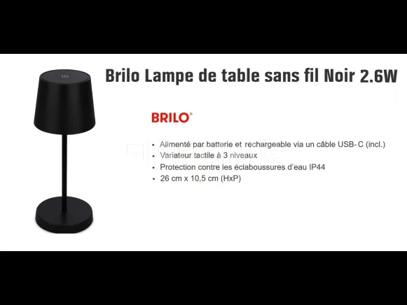 Draadloze tafellamp voor binnen of buiten Zwart Merk: BRILO Vermogen: 2,6 W Conditie: Nieuw Verzending: Tarief A