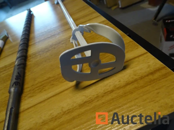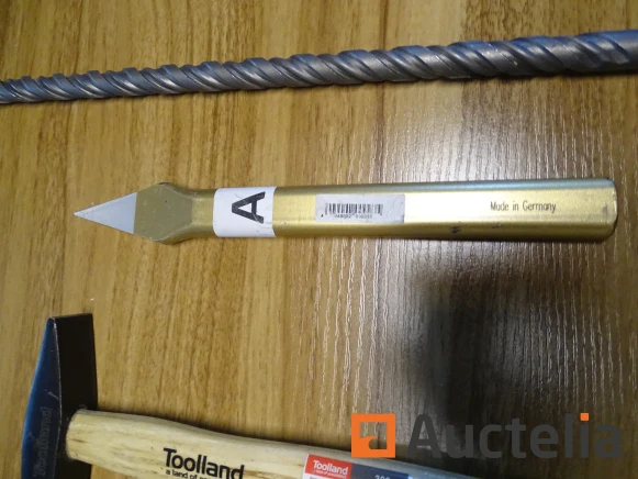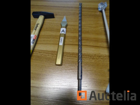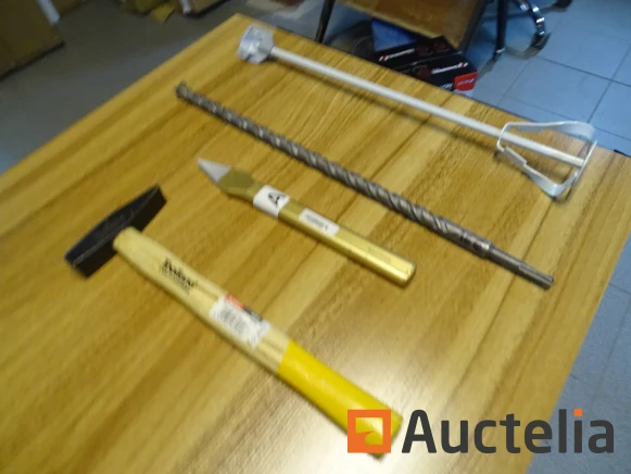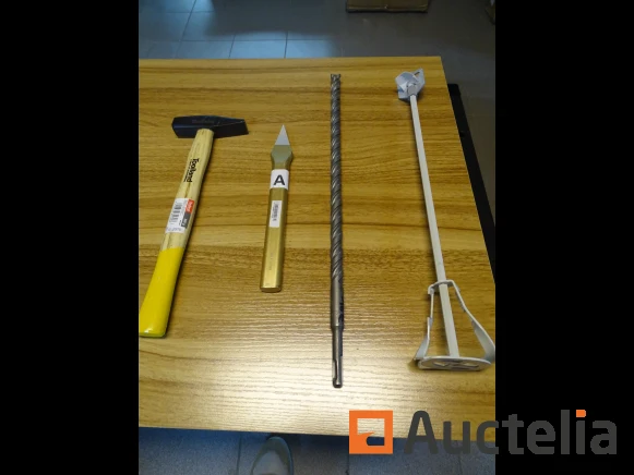 Kleine verfmixer Dimensie: . Lengte: 40 cm . Doorsnede: 6,5 cm Conditie: Nieuw SDS 4-punts boor Dimensie: . Lengte: 40 cm . Doorsnede: 20 mm Conditie: Nieuw Puntige beitel Conditie: Nieuw Hamer 300 gr Merk: TOOLLAND Conditie: Nieuw Verzending: Tarief A