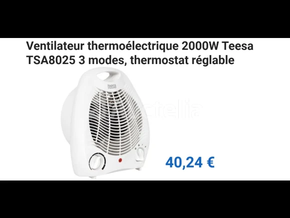Thermo-elektrische ventilator Merk: TEESA Model: TSA8025 Vermogen: 2000 W Conditie: Nieuw Verzending: Tarief A