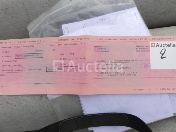 Landbouw tractor Merk: Massey Ferguson Model: 3650 4WD Jaar: 1998 Uren: 2201 Lengte: 500 cm Breedte: 240 cm Hoogte: 300 cm Datum van 1e inschrijving: 10-03-98 Brandstof: Diesel Certificaat van overeenstemming: Nee Certificaat van keuring bij de technische keuring: Nee Bewijs van inschrijving deel 1: Ja Bewijs van inschrijving deel 2: Nee Voertuig nog in dienst (kilometerstand evolueert): Nee Chassisnummer: SMFA44TCOW8602172 Staat: Niet getest Niet inbegrepen: Klepelmaaier Het voertuig startte tijdens de inventarisatie Aanwezigheid van stoten, krassen en oxidatie door normale slijtage Voertuig rijden op het moment van ophalen Opmerkingen: Aanbevolen bezoek Het voertuig heeft tijdens de inventarisatie geen grondige inspectie ondergaan en kan niet-zichtbare gebreken vertonen