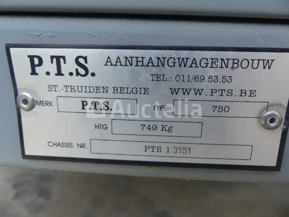 Aanhangwagen Merk: PTS Model: 750 Lengte: 365 cm Breedte: 175 cm Hoogte: 130 cm MMA: 750 kg Chassisnummer: PTS13151 Afmetingen kast: 258 cm 133 cm x 45 cm