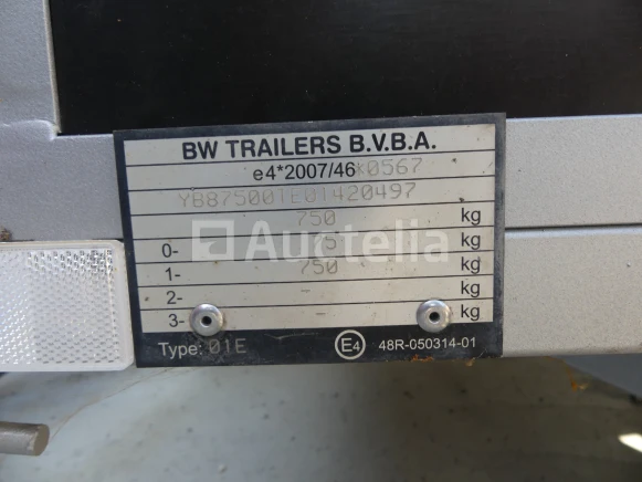 Aanhangwagen Merk: BW Trailers Model: 01E Lengte: 360 cm Breedte: 140 cm Hoogte: 110 cm MMA: 750 kg Chassisnummer: YB87500TE01420497 Afmetingen koffer: 248 cm x 125 cm x 30 cm