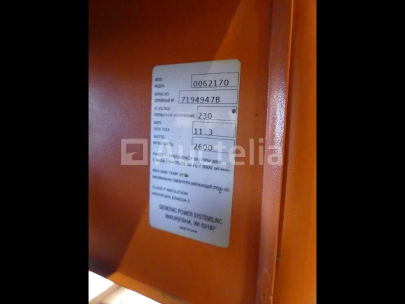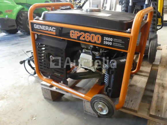 Generator Merk: Generac Model: GP2600 Lengte: 63 cm Breedte: 40 cm Hoogte: 53 cm Status: Functioneel op Inventarisatiedag Aantal uitgangen: 2 x 230 V enkelfasig