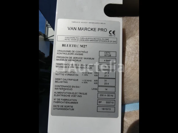 Olieketel Merk: Van Marcke Model: BlueTech M27 Jaar: 2013 Lengte: 45 cm Breedte: 70 cm Hoogte: 85 cm Staat: Niet getest