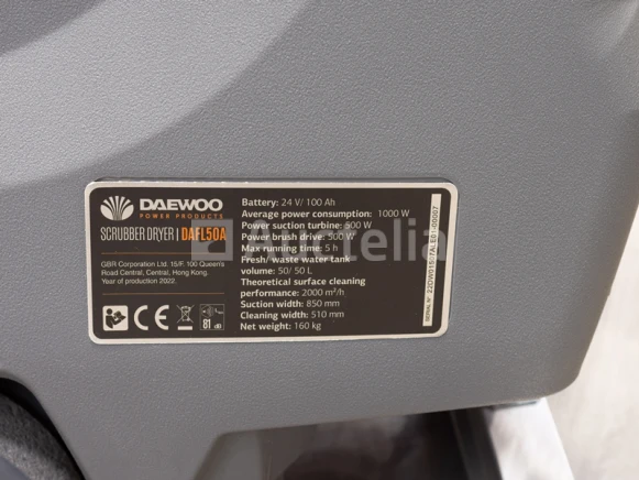 Power: Battery: 24V / 100Ah Avarage power consumption: 1000 W Power suction turbine: 500 W Power brush drive: 500 W Max running time: 5 h Cleaning brushes: Brush speed: 175 rpm Brush diameter: 510 mm Vacuuming: Vacuum power, air volume (max): 24 L/s Vacuuming power, negative pressure (max): 120 kPA (mbar) Dimensions and weights: Theoretical surface cleaning Performance: 2000 m²/h Suction width: 850 mm Cleaning width: 510 mm Max. working range incline: 2% Fresh/ waste water tank volume: 50/ 50 L Max. water temperature 60°C Ambient temperature 5- 40°C Net weight 160 kg Dimentions of battery compartment: 350 x 350 mm Values determined as per EN60335-2-72: Total oscillation value:
