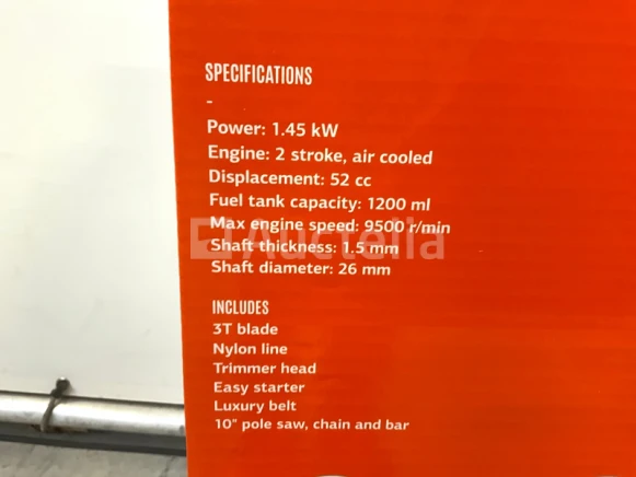 Power 1.45kw; 2 takt; 52cc; tankcapaciteit 1200ml; Max 9500 rpm; shaft thickness 1.5mm; shaft diameter 26mm; 3T blade; nylon trimmer; trimmer head; easy starter; belt; 10" pole saw, chain and bar;