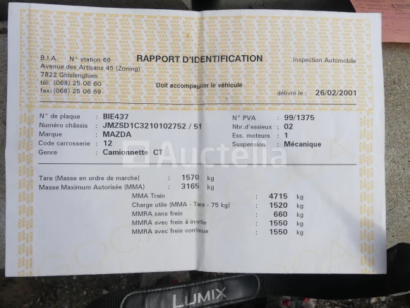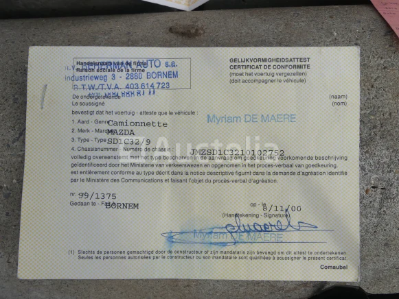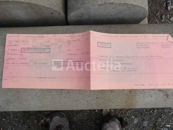 Platte bestelwagen Merk: Mazda Model: E2200 Jaar: 2000 Kilometerstand : 143970 Datum van 1e inschrijving: 04-12-00 Brandstof: Diesel Versnellingsbak: Handgeschakeld MMA: 3165 kg Tarra: 1570 kg Ophanging: Mechanisch Radio: Ja Aantal toetsen: 1 Aantal zitplaatsen: 3 Certificaat van overeenstemming: Ja Certificaat van keuring bij de technische keuring: Nee Bewijs van inschrijving deel 1: Ja Bewijs van inschrijving deel 2: Nee Gegevensblad vrachtwagen: Nee Identificatierapport: Ja Voertuig nog in dienst (kilometerstand evolueert): Nee Chassisnummer: JMZSD1C3210102752 Staat: Niet getest Het voertuig startte tijdens de inventarisatie Voertuig rijden op het moment van ophalen Geleverd zonder kenteken Inwendige afmetingen van het zeildoek: 310x160x155 cm Opmerkingen: Aanbevolen bezoek Het voertuig heeft tijdens de inventarisatie geen grondige inspectie ondergaan en kan niet-zichtbare gebreken vertonen