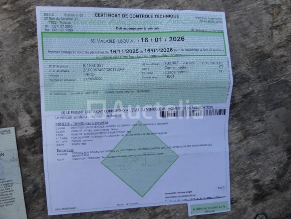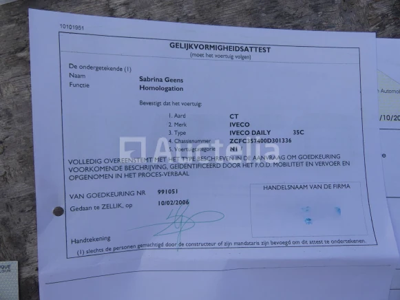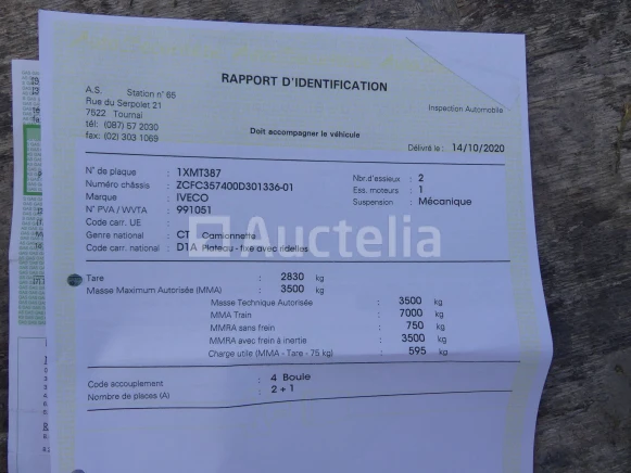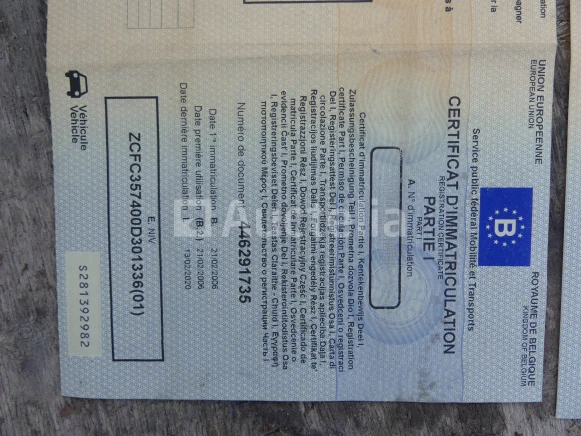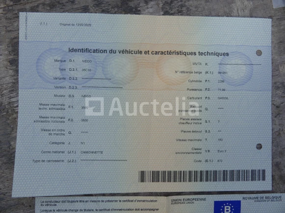 Dump bestelwagen Merk: Iveco Model: 35C10 Jaar: 2006 Kilometerstand: 196690 Lengte: 543 cm Breedte: 205 cm Hoogte: 240 cm Gewicht: 2830 kg Vermogen: 71 kW Datum 1e inschrijving: 21-02-06 Brandstof: Diesel Verplaatsing (cm³) : 2286 Versnellingsbak: Handgeschakeld Radio: Ja Aantal toetsen: 1 Aantal zitplaatsen: 3 Certificaat van overeenstemming: Ja Kentekenbewijs Deel 1: Te controleren Bewijs van inschrijving deel 2: Ja Voertuig nog in dienst (kilometerstand evolueert): Nee Chassisnummer: ZCFC357400D301336 Euronorm: 2 Status: Functioneel op Inventarisatiedag Afmetingen van de kipper: 340 cm x 200 cm x 114 cm Opmerkingen: Tegel aan de bestuurderszijde kan niet meer worden gemonteerd