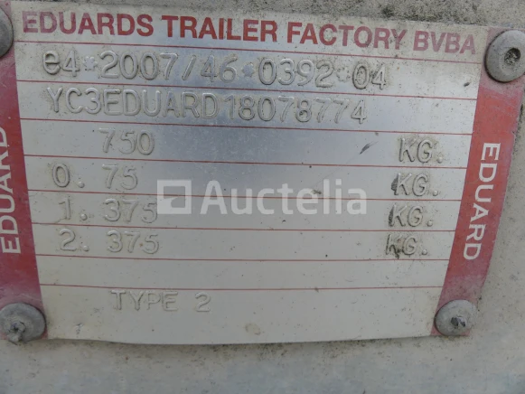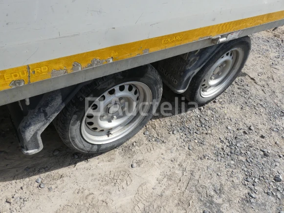 Dubbelassige aanhangwagen Merk: Eduard Model: 2 Lengte: 460 cm Breedte: 170 cm Hoogte: 150 cm MMA: 750 kg Chassisnummer: YC3EDUARD18078774 Afmetingen koffer: 310 cm x 162 cm x 30 cm