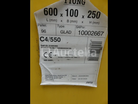 Ytong-blok Lengte: 60 cm Breedte: 10 cm Hoogte: 25 cm Hoeveelheid :+/- 106 Kavel verdeeld over 2 pallets