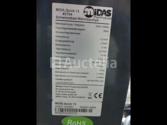 Zwembad warmtepomp Merk: Midas Spanning: 230V Mono Lengte: 96 cm Breedte: 60 cm Hoogte: 70 cm De motor draait