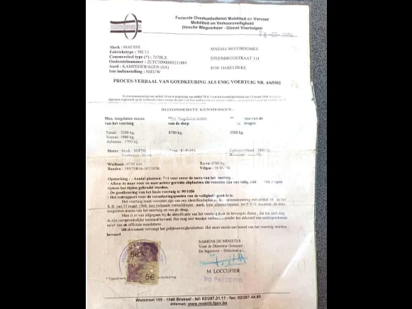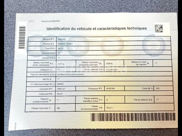 Stacaravan Merk: MAESSS Model: 7570LX Jaar: 2004 Kilometerstand : 153190 Gewicht: 4380 kg Vermogen: 94 kW Datum van 1ste inschrijving : 03-06-04 Brandstof: Diesel Verplaatsing (cc³) : 2800 Versnellingsbak: Handgeschakeld Radio: Ja Aantal toetsen: 1 Aantal zitplaatsen: 2 Certificaat van overeenstemming: Ja Certificaat technische keuring: Ja Technisch keuringscertificaat geldig tot: : 15-05-26 Bewijs van inschrijving deel 1: Ja Bewijs van inschrijving deel 2: Ja Voertuig nog in dienst (kilometerstand evolueert): Nee Chassisnummer: ZCFC509000D231884 Euro Standaard: 3 Status: Functioneel op Inventarisatiedag