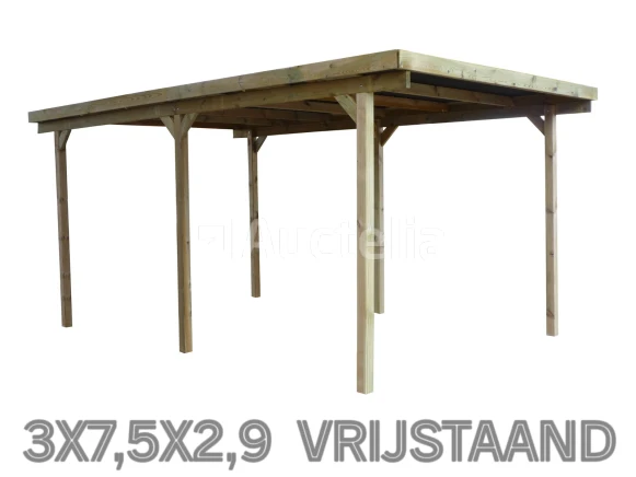 1x Overkapping/carport met een doorrijhoogte van 290 cm ,type plat dak,afmeting lxbxh 750x300x290,materiaal grenen geimpregneerd bevestigingsmateriaal verzinkt,staanders 9x9 cm,dakplaten niet aanwezig,dakbalken ja,montagemateriaal en montagehandleiding bijgeleverd,gewicht ca 70 kg afmeting ngebonden bouwpakket lxbxh 304x50x50cm,exclusief paalvoet zie elders op veiling.